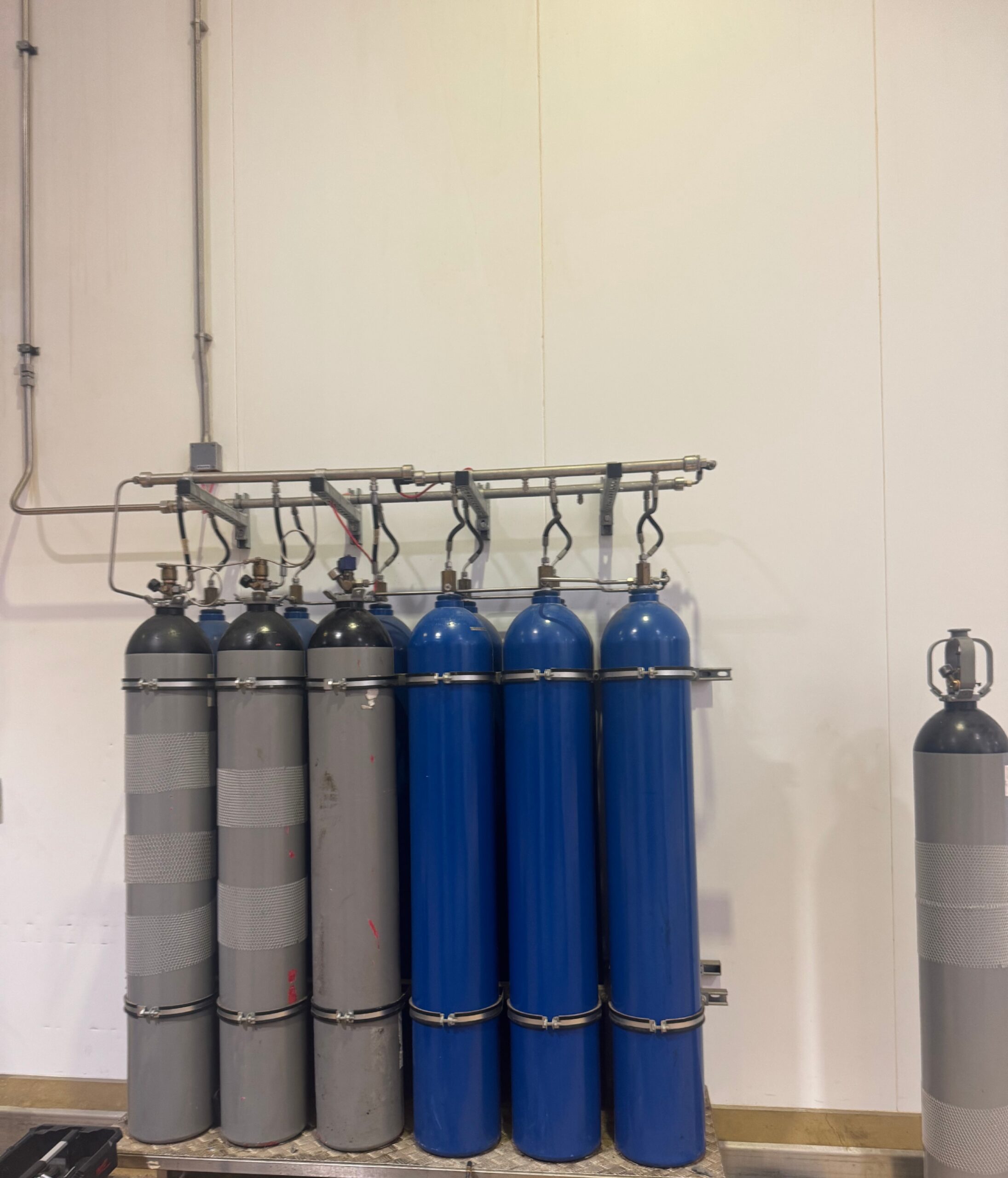 Cylinder systems are compact and require less space than pump‑based systems. They use nitrogen and water cylinders connected via a manifold.